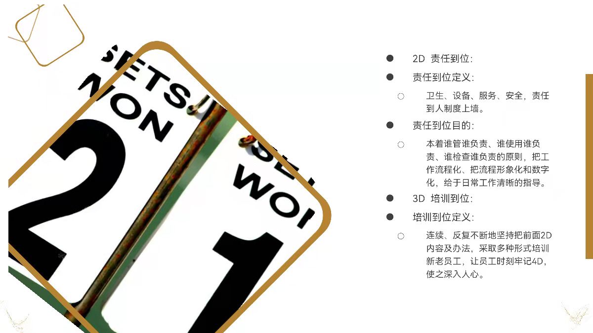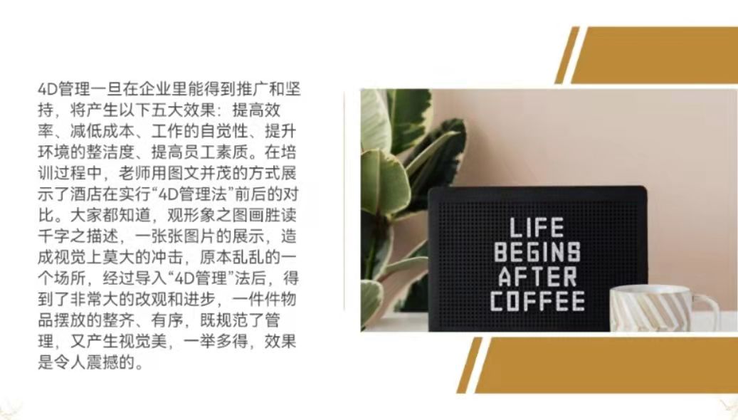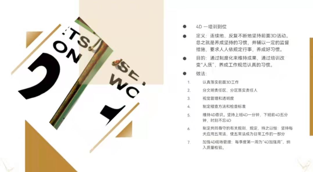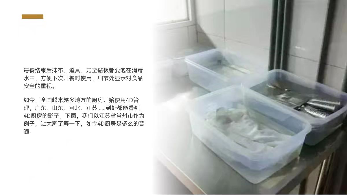 全体领导和员工都坚持执行“4D”厨房管理制度,从管理的制 度到人员,从环境卫生到食品加工,从消毒消杀到垃圾处理。