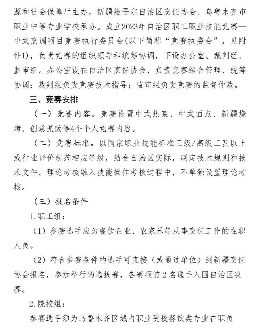 关于举办 2023 年自治区职工职业技能竞赛 — — 中式烹调项目竞赛的通知